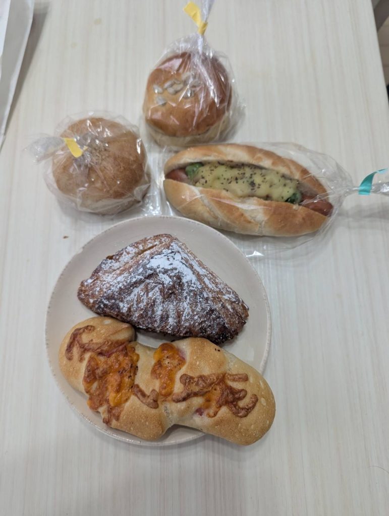 今回、購入したパンはチーズベーコン、アップルシナモン、メキシカンドッグ、チョコパン、あんパンです。